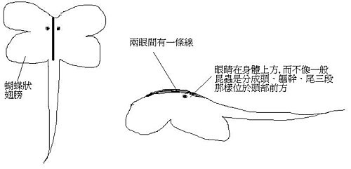 週六早上老爸先去參加某個活動開幕,當時客廳只有老媽和乾媽兩人,而老媽剛洗完澡站在落地窗旁擦乾頭髮,一邊看陽台上的花花草草,突然她叫了一聲「你怎麼在這裡?」然後就叫乾媽過去看,兩人開始不斷談論,我當時正端著咖啡上樓準備工作,所以沒湊過去 (已經習慣老爸老媽會看到奇特的東西了)。不久後老爸回來準備要到光德寺,我下樓送他們出門,老媽和乾媽開始形容她們看到的「蟲」給老爸和我聽。說是「蟲」的原因在於它有蝴蝶翅膀,全身是墨綠色閃金粉的顏色,特別的是,它不像一般昆蟲是分成頭、軀幹和尾部三段而眼睛位於頭部前方,而是「沒有頭部,只有軀幹和尾部」的蟲,眼睛在軀幹上方;而且它跟老媽對看約半分鐘後,老媽又叫乾媽來看了一陣子,它才突然從葉子上「跳下來」,動作不像毛蟲是慢慢蠕動爬行的,而且跳下來後馬上消失,老媽她們在花盆四周遍尋不著 (原本老媽想再叫我下樓看,但已經找不到了)。
